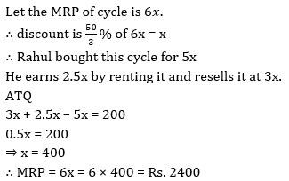 Q13. राहुल अंकित मूल्य पर 16⅔% की छूट पर एक साइकिल खरीदता है. वह इसे 200 दिनों के लिए किराए पर देकर क्रय मूल्य की आधी राशि कमा लेता है. इसके बाद वह साइकिल को अंकित मूल्य के आधे मूल्य पर दोबारा बेच देता है. इस सौदे में उसे 200 रु. का लाभ होता है, साइकिल का अंकित मूल्य कितना है(रु. में)?