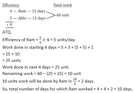 Q4. राम एक कार्य को 15 दिन में पूरा कर सकता हैं जबकि अभि समान कार्य को 12 दिन में पूरा कर सकता हैं. यदि राम अपनी सामान्य क्षमता की 5/4 क्षमता से कार्य करता है और प्रत्येक चौथे दिन अभि द्वारा उसकी सहायता की जाती है, तो राम द्वारा कार्य किये गये दिनों की संख्या ज्ञात कीजिये?