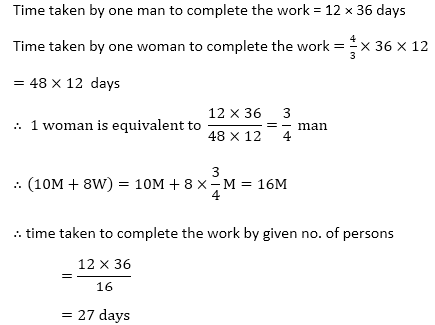 Q3. 12 पुरुष एक कार्य को 36 दिन में पूरा करते हैं जबकि 12 महिलायें इसी कार्य के 3/4 को 36 दिन में पूरा करती हैं. 10 पुरुष और 8 महिलायें एकसाथ इस कार्य को कितने दिनों में पूरा करेंगी?