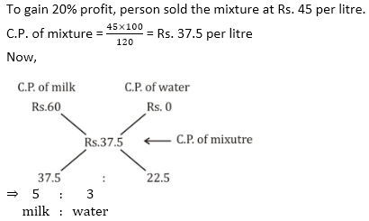 Q5. एक व्यक्ति के पास 60 रूपये प्रति लीटर मूल्य का दूध है. दूध में पानी को किस अनुपात में मिलाया जाना चाहिए ताकि मिश्रण को 45 रूपये प्रति लीटर के मूल्य पर बेचने पर उसे 20% का लाभ प्राप्त हो?