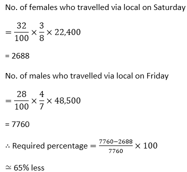 Q14. शनिवार को स्थानीय ट्रेन से यात्रा करने वाली महिलाओं की कुल संख्या शुक्रवार को स्थानीय ट्रेन से यात्रा करने वाले पुरुषों की कुल संख्या का लगभग कितना प्रतिशत है?