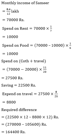 Q15. समीर की सालाना आय 8.4 लाख रुपये है. वह किराए पर भोजन पर और शेष का 11/20 कपड़ो और यात्रा पर खर्च करता है. तो कुल बचत और सालाना यात्रा पर खर्च के बीच का अंतर ज्ञात कीजिये, यदि कपड़ो और यात्रा पर खर्च राशि के बीच का अनुपात 17: 8 है?