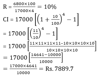 Q12. 17000 रुपये की राशि पर चार वर्ष के अंत में अर्जित साधारण ब्याज 6800 रूपये है. समान अवधि के लिए समान राशि पर अर्जित चक्रवृद्धि ब्याज कितना होगा?