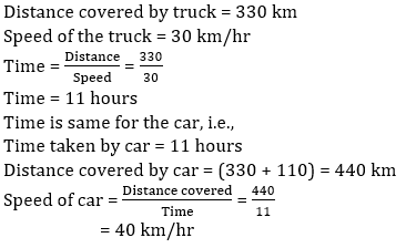 Q11. एक ट्रक 30 किमी/घंटा की गति से 330 किमी की दूरी तय करता है. एक कार की औसत गति क्या होगी जो समान समय में ट्रक की तुलना में 110 किमी अधिक दूरी तय करती है?