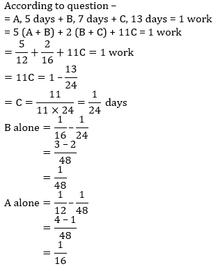 Q13. A और B एक साथ किसी कार्य को 12 दिनों में कर सकते हैं और B और C एक साथ 16 दिनों में कर सकते हैं। यदि A द्वारा 5 दिनों तक और B द्वारा 7 दिनों तक कार्य करने के बाद शेष कार्य C द्वारा 13 दिन में पूरा किया जाता है। तो तीनों अकेले पूरा कार्य व्यक्तिगत रूप से कितने दिन में कर सकते हैं?