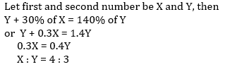 Q12. जब किसी संख्या का 30 प्रतिशत किसी दूसरे संख्या में जोड़ा जाता है तो दूसरा नंबर इसके 140 प्रतिशत तक बढ़ जाता है। पहले से दूसरे नंबर के बीच अनुपात क्या है?