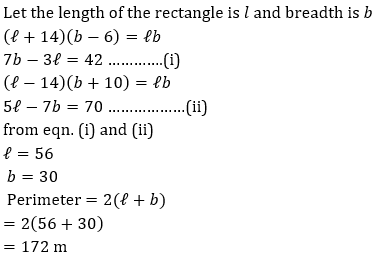Q8. एक आयताकार मैदान की लंबाई 14 मीटर तक बढ़ती है और चौड़ाई 6 मीटर तक कम होती है, मैदान का क्षेत्रफल अपरिवर्तित रहता है. यदि लम्बाई 14 मीटर तक कम होती है और चौड़ाई 10 मीटर तक बढ़ती है, तब भी क्षेत्रफल अपरिवर्तित रहता है. आयत की परिमाप ज्ञात कीजिये..