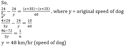 Q7. एक कुत्ता 50 किमी की यात्रा के बाद एक स्वामी से मिलता है जो उसे धीमा जाने की सलाह देता हैं. उसके बाद वह अपनी पूर्व गति की 3/4 गति से चलता है और अपने गंतव्य स्थान पर 35 मिनट की देरी से पहुँचता है. यदि उनकी मुलाकात 24 किमी आगे हुई होती तो कुत्ता अपने गंतव्य स्थान पर25 मिनट की देरी से पहुँचता. कुत्ते की गति कितनी है?