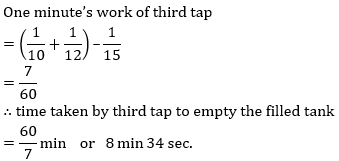 Q6. एक टैंक भरने के लिए दो नल और एक तीसरा नल इसे खाली करने के लिए है. जब तीसरा नल बंद होता है, तो वे टैंक को क्रमशः 10 मिनट और 12 मिनट में भर सकते हैं. यदि सभी तीन नल खोले जाते है तो टैंक 15 मिनट में भर जाता है. यदि पहले दो नल बंद कर दिए जाते हैं, तो तीसरे नल को टैंक को खाली करने में लगभग कितना समय लगेगा?