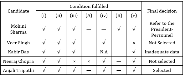 Q5. अंजलि त्रिपाठी ने कार्मिक प्रबंधन में स्नातक में 52 प्रतिशत अंक और स्नातकोत्तर डिग्री में 62 प्रतिशत अंक हासिल किए हैं. उसने चयन प्रक्रिया में 48% अंक भी हांसिल किये हैं. अपनी स्नातकोत्तर डिग्री पूरी करने के बाद एक संगठन में कार्मिक विभाग में पिछले सात वर्षों से काम रही है. उसका जन्म 8 जून 1974 को हुआ था.