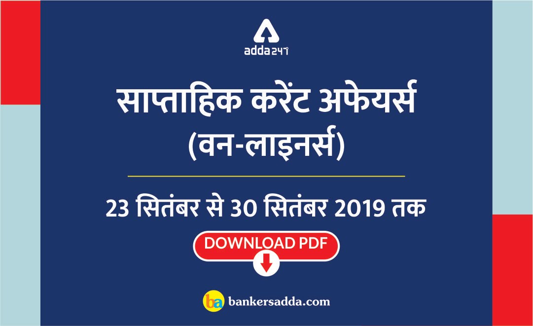 साप्ताहिक करेंट अफेयर्स वन-लाइनर 23 सितम्बर से 30 सितम्बर 2019 तक PDF