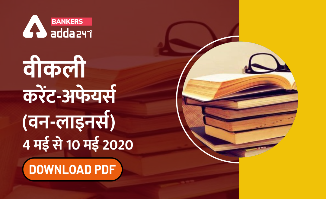Adda247 आपको डेली बेसिस पर करेंट अफेयर क्विज़ प्रदान करता है. आज हम आपकी तैयारी को आसान बनाने के लिए 04 मई से 10 मई, 2020 तक के Important Events की PDF प्रदान कर रहे हैं, जिसमें पूरे सप्ताह के करंट अफेयर्स होंगे. करेंट अफेयर्स SBI, IBPS, SSC, Railways, SEBI Grade-A और अन्य बैंकिंग या इंश्योरेंस परीक्षाओं में General Awareness या सामान्य जागरूकता में बेहतर Marks लाने में बहुत महत्वपूर्ण भूमिका निभाते हैं. इस बार वन-लाइनर्स में Cover किये गये कुछ Topics हैं :