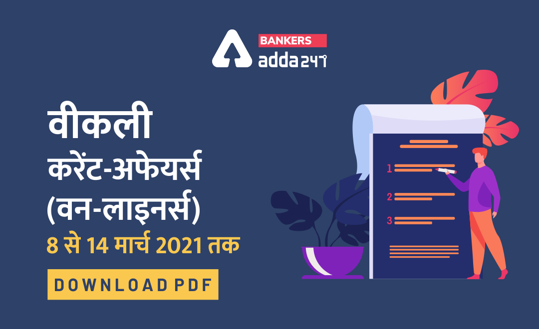 इस बार के वीकली करेंट अफेयर्स वन-लाइनर्स यानि 08 मार्च से 14 मार्च 2021 में कई महत्वपूर्ण और खास समाचार दिए गए है, जो अगामी परीक्षाओं के लिए काफी महत्वपूर्ण है. जैसा कि हम सभी जानते है lockdown के बाद फिर से competitive exams आयोजित होने लगे हैं ऐसे में उम्मीदवारों को घर में रह कर ही ऑनलाइन स्टडी करनी चाहिए, जिसमें Adda247 आपकी मदद करेगा. आपके पास अब ढेरों अवसर हैं, नए नोटिफिकेशन आ रहे हैं, आए दिन परीक्षाएं फिर से आयोजित की जा रही हैं, इसलिए अब आपको करेंट अफेयर्स की भी तैयारी करना ज़रूरी है, और इसलिए हम आपके लिए हर सप्ताह की तरह लेकर आये हैं –Weekly करेंट अफेयर्स वन-लाइनर्स. साथ ही Adda247 आपको डेली बेसिस पर करेंट अफेयर क्विज़ भी प्रदान करता है.