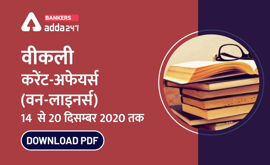 14 दिसम्बर से 20 दिसम्बर 2020 तक के Important Events की PDF प्रदान कर रहे हैं, जिसमें पूरे सप्ताह के करंट अफेयर्स दिए जा रहे हैं. करेंट अफेयर्स SBI, IBPS, RRB , SSC, Railways, SEBI Grade-A और अन्य बैंकिंग या इंश्योरेंस परीक्षाओं में General Awareness या सामान्य जागरूकता में बेहतर Marks लाने में बहुत महत्वपूर्ण भूमिका निभाते हैं.