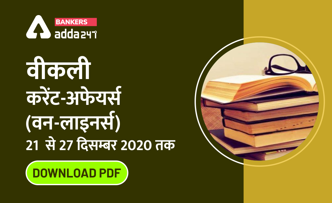 अब हम आपकी तैयारी को आसान बनाने के लिए 21 दिसम्बर से 27 दिसम्बर 2020 तक के Important Events की PDF प्रदान कर रहे हैं, जिसमें पूरे सप्ताह के करंट अफेयर्स दिए जा रहे हैं. करेंट अफेयर्स SBI, IBPS, RRB , SSC, Railways, SEBI Grade-A और अन्य बैंकिंग या इंश्योरेंस परीक्षाओं में General Awareness या सामान्य जागरूकता में बेहतर Marks लाने में बहुत महत्वपूर्ण भूमिका निभाते हैं.