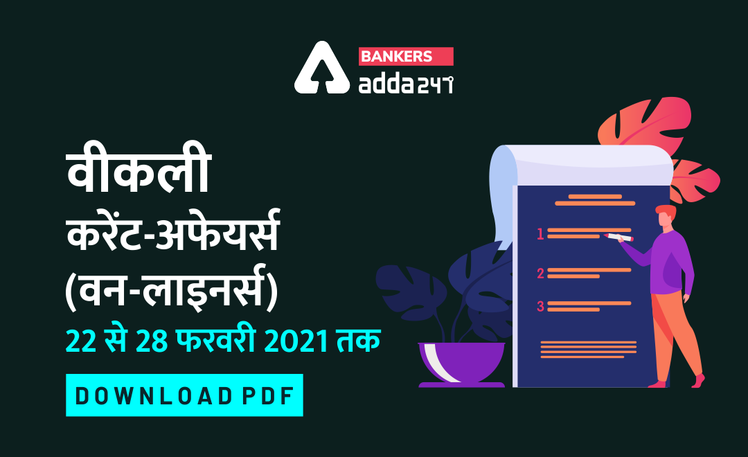 इस बार के वीकली करेंट अफेयर्स वन-लाइनर्स यानि 15 फरवरी से 21 फरवरी 2021 में कई महत्वपूर्ण और खास समाचार दिए गए है, जो अगामी परीक्षाओं के लिए काफी महत्वपूर्ण है. जैसा कि हम सभी जानते है lockdown के बाद फिर से competitive exams आयोजित होने लगे हैं ऐसे में उम्मीदवारों को घर में रह कर ही ऑनलाइन स्टडी करनी चाहिए, जिसमें Adda247 आपकी मदद करेगा. आपके पास अब ढेरों अवसर हैं, नए नोटिफिकेशन आ रहे हैं, आए दिन परीक्षाएं फिर से आयोजित की जा रही हैं, इसलिए अब आपको करेंट अफेयर्स की भी तैयारी करना ज़रूरी है, और इसलिए हम आपके लिए हर सप्ताह की तरह लेकर आये हैं –Weekly करेंट अफेयर्स वन-लाइनर्स. साथ ही Adda247 आपको डेली बेसिस पर करेंट अफेयर क्विज़ भी प्रदान करता है.
