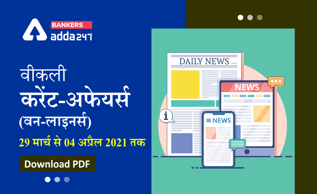 इस बार के वीकली करेंट अफेयर्स वन-लाइनर्स यानि 29 मार्च से 04 अप्रैल 2021 में कई महत्वपूर्ण और खास समाचार दिए गए है, जो अगामी परीक्षाओं के लिए काफी महत्वपूर्ण है. जैसा कि हम सभी जानते है lockdown के बाद फिर से competitive exams आयोजित होने लगे हैं ऐसे में उम्मीदवारों को घर में रह कर ही ऑनलाइन स्टडी करनी चाहिए, जिसमें Adda247 आपकी मदद करेगा. आपके पास अब ढेरों अवसर हैं, नए नोटिफिकेशन आ रहे हैं, आए दिन परीक्षाएं फिर से आयोजित की जा रही हैं, इसलिए अब आपको करेंट अफेयर्स की भी तैयारी करना ज़रूरी है, और इसलिए हम आपके लिए हर सप्ताह की तरह लेकर आये हैं –Weekly करेंट अफेयर्स वन-लाइनर्स. साथ ही Adda247 आपको डेली बेसिस पर करेंट अफेयर क्विज़ भी प्रदान करता है.